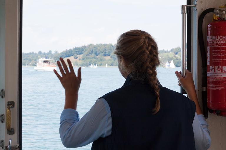 Keywords: person human female woman wave crew best regards friendly hand summer idyllic silhouette fire extinguisher lake tegernsee upper bavaria farewell good bye work clothes