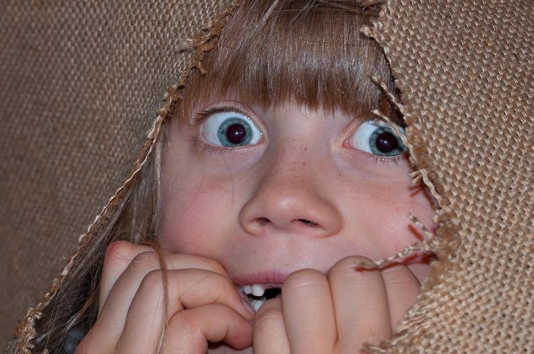 Keywords: person human girl child eyes face frightened scared anxious fear emotions jute jute bag close