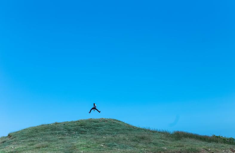Keywords: person man male jumping top hill happy joyful lifestyle active sport human meadow sky outdoor