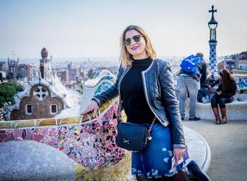Keywords: person people woman barcelona spain gaudi guell park architecture travel lifestyle city female caucasian young tourist girl happy europe tourism outdoor catalonia smiling urban
