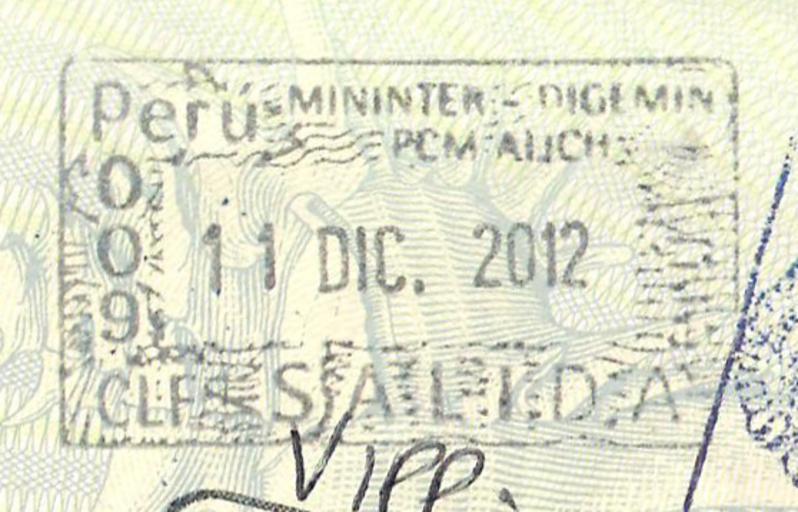 Keywords: Peru exit stamp.png Peruvian exit stamp issued at Lima Airport Own 2012-12-12 Gabriel Currie Cc-zero Original upload log en wikipedia Belb CommonsHelper en wikipedia Peru+exit+stamp png 2012-12-12 21 01 Chachu207 558×358× 420871 bytes <nowiki> Peruvian exit stamp issued at Lima Airport own Dec 12 2012 Gabriel Currie </nowiki> Passport stamps of Peru |