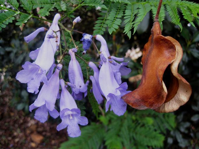 Keywords: petals flowers jakaranda purple trumpet shaped seedpod brown foliage green fine