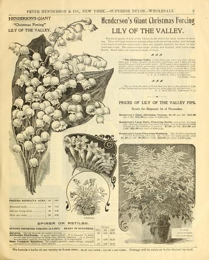 | Keywords: Peter Henderson and Co.'s low quotations on bulbs for import orders to be shipped as soon as new crops are ready during summer and autumn (16024592644).jpg PETER HENDERSON CO NEW YORK SUPERIOR BULBS WHOLESALE <br> H ENDERSON S GIANT <br> Christmas Forcing ' <br> LILY OF THE VALLEY <br> I <br> Henderson's Giant Christmas Forcing <br> LILY OF THE VALLEY <br> The finest grade of Lily of the Valley in the world for early winter flower- <br> ing They will bear twelve to sixteen large bells on strong stalks with foliage <br> even when forced for extra early ; they are equally superior for later or suo <br> cessional crops The pips average large plump and regular with extra lonjf <br> Roots Read what our customers think of them <br> t V <br> The Christmas Valley / had from you were x ery fine better <br> than any I have handled in i8 years experience and I have kicked <br> fnyself because I did not order inore Will ivant a large quantity next <br> season; eant compete now-a-days unless you have something' a little <br> better than the other felloiv and the extra price received more than <br> pays the diffe7-ence in cost between N o I stock and ordinary and there <br> is a satis/action outside o/ dollars and cents that goes a longiuay <br> S A E LYMAN Eisex Greenhouses <br> Coe Ridge Ohio <br> V <br> ' IVe see firottt the style of blooin that you have a fine strain of Lily <br> o/the Valley and you may book us /or 30 000 pips /or /all delivery ' <br> A S MACBEAN Lakeivood N J <br> PRICES OF LILY OF THE VALLEY PIPS <br> Ready for Shipment 1st of November <br> Henderson's Qiant Christmas Forcing 1 75 per 100; <br> per 1 000 ; 34 00 per case of 2 500 pips <br> 15 00 <br> Henderson's Large Early Flowering Berlin extra size 3 years <br> old sand-grown pips for early forcing can be flowered with <br> foliage by the holidays if needed 1 50 per 100; 11 00 per <br> 1 000 ; 26 00 per case of 2 500 pips <br> Henderson's Large Flowering Hamburg The florist's standard <br> sort for flowering after Jan 1st i-vear old sand-grown pips <br> 1 25 per 100; 9 50 per 1 000; 22 00 per case of 2 500 pips <br> PREESIA REFRACTA ALBA <br> 100 <br> 1000 <br> Matnmoth bulbs <br> 80 <br> 60 <br> 50 <br> 7 00 <br> 5 00 <br> First size bulbs <br> 4 00 <br> SF IREK OR MSTII-OE <br> STRONG IMPORTED FORCING CLUMPS READY IN NOVEMBER <br> Prices <br> Doz <br> 100 <br> lOOO <br> 50 <br> 75 <br> 75 <br> 3 00 <br> 4 00 <br> 4 0C <br> 28 00 <br> 35 00 <br> Astilboides Floribunda A great improvement It is d-var/er in habits <br> earlier and more prof use in bloom thayt Spiraa Japonica As a florists' <br> market plant and for forcing for cut floivers it is unr/z'alled <br> Nana Compacta Multiflora Of compact growth ample foliage magnifi- <br> cent panicles of feathery white flowers <br> 35 00 <br> We furnish 6 bulbs of one variety at dozen rates ; 25 at 100 rates ; 250 at 1 000 rates Postage will be extra on bulbs desired by mail 42332581 133831 66658 Page 5 Text http //www biodiversitylibrary org/page/42332581 1901 10 5962/bhl title 66658 Henry G Gilbert Nursery and Seed Trade Catalog Collection ; Peter Henderson Co NameFound Astilboides NameConfirmed Astilboides EOLID 2886988 NameBankID 1812470 NameFound Compacta NameConfirmed Compacta EOLID 10934908 NameBankID 2627020 NameFound Floribunda NameConfirmed Floribunda EOLID 5190123 NameBankID 3474597 NameFound Multiflora NameConfirmed Multiflora Small J M MacDougal Feuillet supersect NameBankID 9260529 Biodiversity Heritage Library Peter Henderson Co 's low quotations on bulbs for import orders to be shipped as soon as new crops are ready during summer and autumn 1901 Garden Stories Bulbs Plants Catalogs Flowers Peter Henderson Co Plants Ornamental Seed industry and trade Seeds Trade catalogs U S Department of Agriculture National Agricultural Library bhl page 42332581 dc identifier http //biodiversitylibrary org/page/42332581 bhlGardenStories Lilies BHLinbloom bulbs plants peter henderson co plants ornamental u s department of agriculture national agricultural library bhlgardenstories bhlinbloom Information field Flickr posted date ISOdate 2015-02-25 CC-BY-2 0 BioDivLibrary https //flickr com/photos/61021753 N02/16024592644 2015-08-24 22 56 48 cc-by-2 0 PD-old-70-1923 Photos uploaded from Flickr by FĂŚ using a script Peter Henderson Co bulbs |