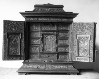 | Keywords: Peter Opel - Cabinet with Scenes from the Life of David - Walters 655 (2).jpg This cabinet with its 17 compartments some hidden is a marvel of woodcarving and a celebration of intricacy Architectural elements and ornamental detailing frame narrative compositions organized into a lattice of ordered compartments Forty-eight scenes relate the Old Testament story of David prophet and king as a model of virtue The vigor of these compositions points to their derivation from woodcut designs by a master such as Joost Amman 1539-1591 but the source is unidentified The significance of each scene is distilled by a Latin motto for example the death of David inside of the right-hand door by PIETATIS DEFUNCTIO a pious death The artist Peter Opel of Regensburg proudly inscribed his name on the door to the central compartment and on the back carved his self-portrait dressed as a gentleman but holding a chisel The chest was designed to hold small treasures and antiquities ca 1580 1590 Renaissance carved pine boxwood cm 72 57 6 accession number 65 5 37703 Arnold Seligmann Rey and Co New York date and mode of acquisition unknown Henry Walters city Baltimore Walters Art Museum Henry Walters Acquired by Henry Walters 1915 Signature; Transcription PIETATIS DEFUNCTIO; Translation a pious death World of Wonder The Walters Art Gallery Baltimore 1971-1972 Highlights from the Collection The Walters Art Gallery Baltimore 1998-2001 place of origin Regensburg Germany <gallery> File Peter Opel - Cabinet with Scenes from the Life of David - Walters 655 jpg </gallery> Walters Art Museum license Renaissance applied arts in the Walters Art Museum Furniture in the Walters Art Museum Peter Opel 16th-century way of life preserved artefacts |