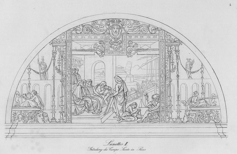 | Keywords: Cornelius Pinakothek Tafel 04.jpg Artwork Creator Peter von Cornelius Lunette II Gründung des Campo Santo in Pisa 1826 - 36 Kupferstich gestochen von H Merz Institution Alte Pinakothek Peter von Cornelius; Entwürfe zu den kunstgeschichtlichen Fresken in den Loggien der Königlichen Pinakothek zu München; Leipzig 1875 self scanned from book PD-old-100 Other versions Entwürfe zu den Fresken der Pinakothek Cornelius Kupferstich, gestochen von H. Merz Alte Pinakothek München en.wikipedia.org/wiki/Alte_Pinakothek "Die Kreuzzüge hatten das Abendland in mannigfache, unmittelbare Berührung mit dem Morgenland gebracht. Kunstübung hatte sich dort, wenn auch nicht in hoher Vollendung, doch ungleich besser erhalten, als im Abendlande, das sich Unterweisung, Meister und Werke dort holte. Aber belebend wirkte zugleich jener fromme Sinn, der auch auf materielle, leblose Erinnerungen an heilige Personen und Orte einen Werth legt. Und als Kaufleute von Pisa Erde vom gelobten Lande als Ballast in ihren Schiffen mit sich in die Heimath geführt, reifte sogleich in dem hohen Rathe der Republik der Plan, diese „heilige Erde“ zu einer Begräbnissstätte zu machen, für ausgezeichnete, um das Wohl des Vaterlandes in Krieg und Frieden besonders verdiente Bürger, und den Ort mit einem würdigen Gebäude zu umgeben. Im Jahre 1278 erhielt der Bildhauer und Baumeister Giovanni Pisano, Sohn des Nichola Pisano, des berühmtesten Bildhauers und Baumeisters seiner Zeit, den Auftrag, den Plan für dieses Gebäude zu entwerfen. Das Bild der Lunette zeigt uns den Künstler, wie er den Stadtältesten den Grund- und Aufriss zur Begutachtung vorlegt. Es ist ein Oblongum für die heilige Erde, bekannt als „Campo santo“, umgeben von einer hohen, nach innen offenen Halle im germanisch-toscanischen Baustyl mit angrenzenden Capellen. Der Plan ward genehmigt, das Gebäude 1283 vollendet. Hinter dem Künstler sieht man bereits Steinmetzen beschäftigt, Capitäle zu meisseln, denen die Antike als Muster dient; denn aus ihren Kriegen mit Sicilien hatten die Pisaner auf ihren Schiffen antike Sarkophage und andere Sculpturen als Siegesbeute mitgebracht, auch im eigenen Lande Alterthümer gefunden und bewahrt, um sie im Campo santo aufzustellen. Die grossen Wandflächen forderten zum malerischen Schmuck heraus. Noch aber war die Malerei weit zurück; sie glich einem Kinde, das zaghaft die ersten Schritte wagt; bald aber wird sie der in ihr sich entwickelnden Kräfte bewusst und entläuft dem leitenden Gängelbande; vielleicht etwas zu früh, wie manche der älteren Malereien im Campo santo (von Antonio Veneziano, von Spinello Aretino) als Beweis angeführt worden können. Die reiche Ornamentik, mit welcher Cornelius die Darstellungen umgeben, weisen auf den Zusammenhang der wiederbelebten Kunst mit dem Alterthume hin; die Statuen aber von Minerva und Mercur darauf, dass der Handels-Verkehr zugleich mit irdischen Schätzen wissenschaftliche und Kunst-Bildung nach Pisa gebracht hat." Bildquelle: commons.wikimedia.org/wiki/File:Cornelius_Pinakothek_Tafe... |