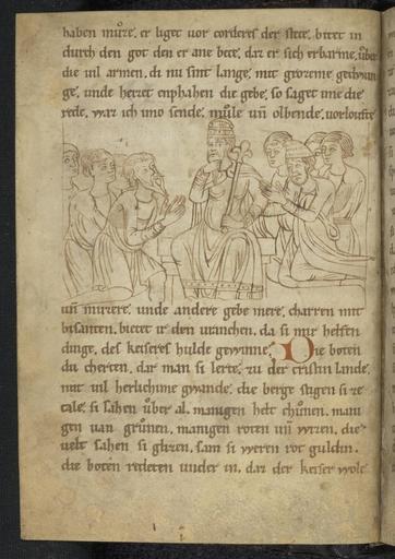 | Keywords: Pfaffe Konrad - Rolandslied - cod. pal. germ. 112 - 018.jpg Pfaffe Konrad - Rolandslied - cod pal germ 112 - jpg 017 019 Die Gesandten des Königs Marsilie vor Kaiser Karl Rolandslied des Pfaffen Konrad à bersetzung bzw Bearbeitung der altfranzösischen Chanson de Roland um 1100 Blatt 8v Pfaffe Konrad Rolandslied Pergament 123 Blatt 21x15 cm Regensburg/Hessen-Thüringen Ende 12 Jahrhundert Cod pal germ 112 Universitätsbibliothek Heidelberg http //diglit ub uni-heidelberg de/diglit/cpg112 century 12 Pfaffe Konrad PD-old Rolandslied Cod Pal germ 112 |