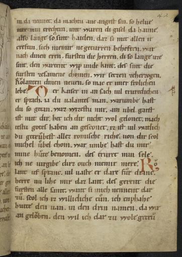 | Keywords: Pfaffe Konrad - Rolandslied - cod. pal. germ. 112 - 085.jpg Pfaffe Konrad - Rolandslied - cod pal germ 112 - jpg 084 086 Rolandslied des Pfaffen Konrad à bersetzung bzw Bearbeitung der altfranzösischen Chanson de Roland um 1100 Blatt 42r Pfaffe Konrad Rolandslied Pergament 123 Blatt 21x15 cm Regensburg/Hessen-Thüringen Ende 12 Jahrhundert Cod pal germ 112 Universitätsbibliothek Heidelberg http //diglit ub uni-heidelberg de/diglit/cpg112 century 12 Pfaffe Konrad PD-old Rolandslied Cod Pal germ 112 |