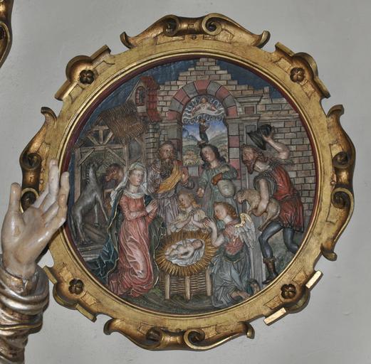 Keywords: Pfullendorf Rosenkranzmedaillon 03.jpg Pfullendorf Stadtkirche St Jakob<br />Rosenkranzmedaillons von Martin Zürn 1615 teilweise um 1900 ersetzt own own photograph 2012-09 Creator Martin Zürn Photo Andreas Praefcke Photos by User AndreasPraefcke Rosenkranzmedaillons Stadtkirche Pfullendorf Reliefs of the nativity of Jesus Christ in Germany Reliefs of the Adoration by the shepherds