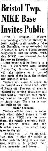 Keywords: blackandwhite monochrome text document black and white First Lt. Douglas G. Waters, commanding officer of Battery D, 506th Anti-Aircraft Artillery Missile Battalion, today extended an invitation to Lower Bucks count residents to visit the Bristol township NIKE base manned by his battery. Open house will be from 1 to 4 p.m. in connection with Armed Forces Day. Special Army buses will take visitors on a tour of both parts of the base, the control and launcher areas. Visitors are asked to report to the control area, Ford road, west of Route 413. The control area is reached by driving about on-half mile west on Route 413, to a black-top road on the right, marked by an Army sign. The area is one half mile up the road. Radar Scanners Visitors will be shown the radar sets which detect enemy aircraft and train NIKE missiles upon them, the missile assembly building, fueling areas, and the launcher racks from which they take to the air. "By this visit," Lt. Waters said, "We hope to give the public a better understanding of our mission, which is to protect their lives, property, and interest." First Lt. Douglas G. Waters, commanding officer of Battery D, 506th Anti-Aircraft Artillery Missile Battalion, today extended an invitation to Lower Bucks count residents to visit the Bristol township NIKE base manned by his battery. Open house will be from 1 to 4 p.m. in connection with Armed Forces Day. Special Army buses will take visitors on a tour of both parts of the base, the control and launcher areas. Visitors are asked to report to the control area, Ford road, west of Route 413. The control area is reached by driving about on-half mile west on Route 413, to a black-top road on the right, marked by an Army sign. The area is one half mile up the road. Radar Scanners Visitors will be shown the radar sets which detect enemy aircraft and train NIKE missiles upon them, the missile assembly building, fueling areas, and the launcher racks from which they take to the air. "By this visit," Lt. Waters said, "We hope to give the public a better understanding of our mission, which is to protect their lives, property, and interest." |