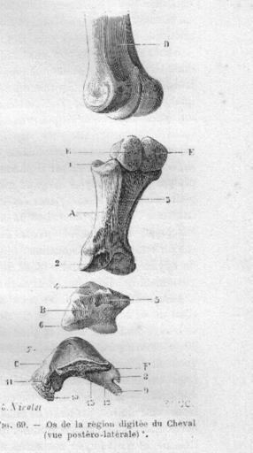 Keywords: PhalChevalChauveauCM1890.jpg en The bones of the digit region of the horse Equus caballus phalanges postero-lateral view fr Les os de la région du doigt du cheval Equus caballus phalanges vue postéro-latérale <br /> A phalange proximale <br /> B phalange médiale <br /> C phalange distale <br /> D extrémité inférieure des os métacarpiens <br /> E grands sésamoïdes <br /> F petit sésamoïde <br /> ” Chauveau Auguste Arloing Saturnin Traité d'anatomie comparée des animaux domestiques <br /> 1 064 p page 123 1890 Paris Lib J B Baillière et Fils domaine public décès des auteurs 1917 et 1911 Meyer C 2011-03-15 PD-old Horse leg bones Phalanges of the foot |