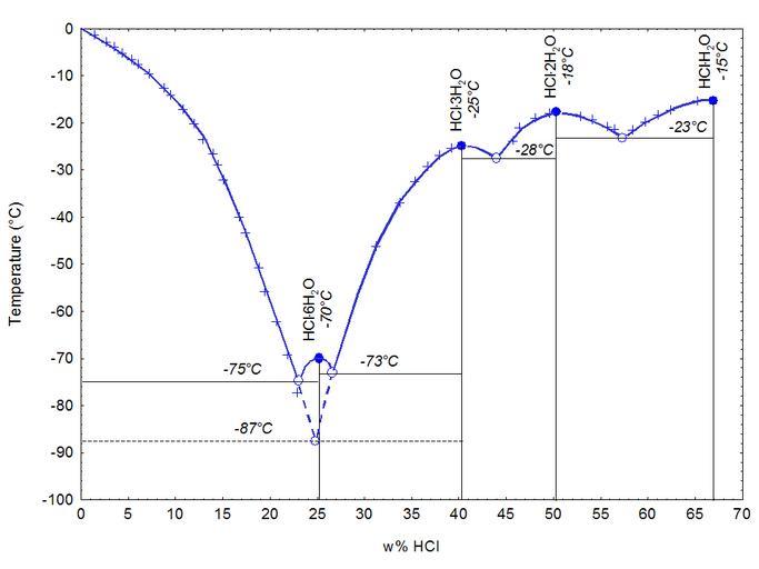 | Keywords: Phase diagram HCl H2O s l.PNG en Solid-liquid phase diagram of binary HCl water mixtures de fest-flüssig Phasendiagramm von HCl-Wasser-Mischungen own Steffen 962 2009-11-13 erstellt aus Daten vom Gmelins Handbuch der anorganischen Chemie plotted with data from the German books Gmelins Handbuch der Anorganischen Chemie Systemnummer 6 Chlor Verlag Chemie Berlin 1927 and Gmelins Handbuch der Anorganischen Chemie Systemnummer 6 Chlor Ergänzungsband Teil B - Lieferung 1 Verlag Chemie Weinheim 1968 Since 1990 the Gmelin was published as Gmelin Handbook of Inorganic and Organometallic Chemistry Phase change diagrams Melting Hydrochloric acid Hydrogen chloride Binary phase diagrams |