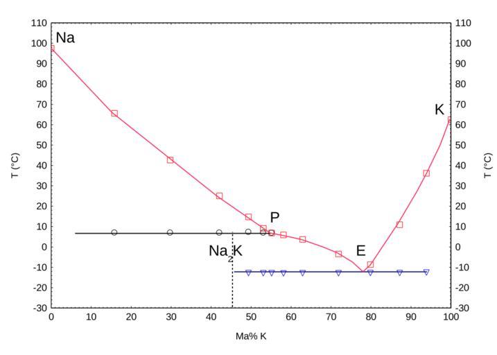 Keywords: Phase diagram potassium sodium s l.svg en Phase diagram potassium sodium de Phasendiagramm Kalium Natrium own Steffen 962 2010-11-01 Daten aus / data from van Rossen G L C M ; van Bleiswijk H à ber das Zustandsdiagramm der Kalium-Natriumlegierungen in Z Anorg Chem 74 1912 152-156 Legende Na - Schmelzpunkt von reinem Natrium K - Schmelzpunkt von reinem Kalium E - Eutektikum P - Peritektikum blaue Linie - Schmelzpunkt der eutektischen Mischung schwarze Linie - inkongruente Schmelze der Verbindung Na<sub>2</sub>K rote Linie - Schmelze der à berschusskomponente Legend Na - melting point of pure sodium K - melting point of pure potassium E - eutectic point P - peritectic point blue line - melting point of eutectic mixture black line - melting point of compound Na<sub>2</sub>K red line - melting point of surplus Binary phase diagrams Sodium Potassium |