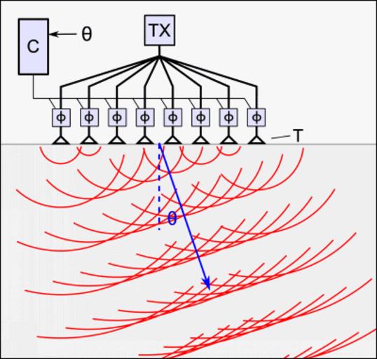 | Keywords: Phased array imaging animation.gif ultrasound imaging array works It consists of a beamforming oscillator TX that produces an electric signal consisting of pulses of sine waves oscillating at an ultrasonic frequency which is applied to an array of transducers T in contact with the skin surface that convert the electric signal into ultrasonic waves traveling through the tissue The timing of the pulses emitted by each transducer is controlled by programmable delay units φ that are controlled by a micropricessor control system C The moving red lines are the wavefronts of the ultrasonic waves emitted by each transducer The wavefronts are spherical but they combine superpose to form plane waves creating a beam of sound traveling in a specific direction Since the pulse from each transducer is progressively delayed going up the line each transducer emits its pulse after the one below it This results in a beam of sound waves emitted at an angle to the array By changing the pulse delays the computer can scan the beam of ultrasound in a raster pattern across the tissue The echoes reflected by different density tissue received by the transducers build up an image of the underlying structures 2016-12-09 own Chetvorno other versions cc-zero Videos of medical ultrasound Animated GIF files |