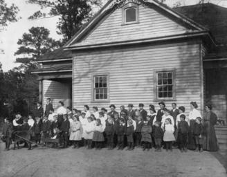 Keywords: blackandwhite monochrome architecture building outdoor black and white Glenwood School, Wayne County, NC; ca 1905. This is an unusual photo of a group children and adults standing outside the Glenwood School. The group is looking off to their right, and not into the viewpoint of the camera. One boy has a goat cart with a little girl sitting in it. A handwritten damaged ID label is affixed to the mounting card; “Glenwood” has been written on the mounting card itself. “A.A. Miller, Goldsboro, N.C.” is embossed on the mounting card. Alexander A. Miller was a photographer active in Goldsboro 1880s-ca 1930. From the Wayne County Schools Photo Collection, PhC.209, State Archives of North Carolina, Raleigh, NC. Glenwood School, Wayne County, NC; ca 1905. This is an unusual photo of a group children and adults standing outside the Glenwood School. The group is looking off to their right, and not into the viewpoint of the camera. One boy has a goat cart with a little girl sitting in it. A handwritten damaged ID label is affixed to the mounting card; “Glenwood” has been written on the mounting card itself. “A.A. Miller, Goldsboro, N.C.” is embossed on the mounting card. Alexander A. Miller was a photographer active in Goldsboro 1880s-ca 1930. From the Wayne County Schools Photo Collection, PhC.209, State Archives of North Carolina, Raleigh, NC.
