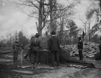 | Keywords: blackandwhite monochrome outdoor black and white Tarring the seine, Greenfield Fishery, Chowan County, NC, c.1905 (N.2000.11.86). Before fishing the seine is run through a large kettle of boiling tar and water and then hung in the sun for several days to dry. This process renders it impervious to water. L-R: a fishing hand; Mr. Cook, the blacksmith from New York state; Frank Wood, owner of Greenfield Fishery and licensed engineer; and Charles Johnson, the clerk from Hertford. The clerk tallied the catch, recording numbers and varieties of fish. The clerk, the blacksmith, and the owner were usually the only white men in the fishery operation. Frank Wood held a steam engineer’s license. He took his engineer’s license exam in Norfolk VA. The boats used at the fishery could not be licensed or operated legally without a licensed engineer. From the Ross and Frances Inglis Photograph Collection, PhC.96, State Archives of North Carolina, Raleigh, NC. Tarring the seine, Greenfield Fishery, Chowan County, NC, c.1905 (N.2000.11.86). Before fishing the seine is run through a large kettle of boiling tar and water and then hung in the sun for several days to dry. This process renders it impervious to water. L-R: a fishing hand; Mr. Cook, the blacksmith from New York state; Frank Wood, owner of Greenfield Fishery and licensed engineer; and Charles Johnson, the clerk from Hertford. The clerk tallied the catch, recording numbers and varieties of fish. The clerk, the blacksmith, and the owner were usually the only white men in the fishery operation. Frank Wood held a steam engineer’s license. He took his engineer’s license exam in Norfolk VA. The boats used at the fishery could not be licensed or operated legally without a licensed engineer. From the Ross and Frances Inglis Photograph Collection, PhC.96, State Archives of North Carolina, Raleigh, NC. |