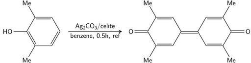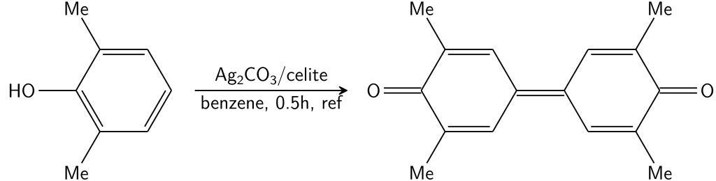 Keywords: Phenol to quinone.svg en Fetizon's reagent oxidizes phenols to quinones which can oxidatively couple to one another own Krishnavedala 2014-08-06 validSVG Fétizon oxidation Quinones Dimerization Cc-zero