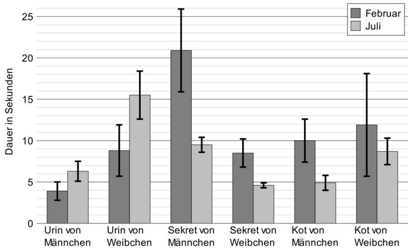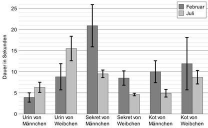 Keywords: Phodopus sungorus DE Markierverhalten.svg Durchschnittliche Dauer in Sekunden die männliche Dsungarische Zwerghamster am Urin am Sekret der Bauchdrüse und am Kot männlicher und weiblicher Artgenossen schnuppern; mit Standardfehlern EN mean number of seconds spent sniffing by Phodopus sungorus males exposed to urine mid-ventral gland secretion and feces from conspecific males and females; with standard errors selbst erstellt mit Gnumeric 1 7 EN own work / nach Natalja Jurjewna Feoktistowa Ilja Grigorjewitsch Meschtscherski Behavioral Responses of Dwarf Hamsters Phodopus roborovskii and Phodopus sungorus to Same-Sex and Opposite-Sex Odors in Different Seasons In Robert E Johnston Dietland Müller-Schwarze Peter W Sorensen Hrsg Advances in Chemical Signals in Vertebrates Kluwer Academic/Plenum Publishers 1999 ISBN 0-306-46114-5 S 431 “436 Englisch; Tab 2 3 2008-03-12 Torben Schink wikitable style text-align center; - rowspan 2 Datum 2 durchschn Tageslänge 3 Lufttemperatur 2 Urin 2 Sekret 2 Kot - niedrigste durchschn höchste Männchen Weibchen Männchen Weibchen Männchen Weibchen - 1 “9  Februar 8 h 50 min ˆ’14 0 Â°C ˆ’3 9 Â°C ˆ’1 0 Â°C 3 9 ±1 1 8 8 ±3 1 20 9 ±5 0 8 5 ±1 7 10 0 ±2 6 11 9 ±6 2 - 7 “17  Juli 17 h 10 min +6 0 Â°C +16 8 Â°C +30 0 Â°C 6 3 ±1 2 15 5 ±2 9 9 5 ±0 9 4 6 ±0 3 4 9 ±0 9 8 7 ±1 6 Die Angaben beziehen sich auf neun unter halbnatürlichen Bedingungen gehaltene männliche Dsungarische Zwerghamster Phodopus sungorus