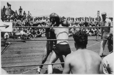 | Keywords: Photograph of Gerald R. Ford, Jr., Watching a Boxing Match on the Flight Deck of the U.S.S. Monterey - NARA - 187032.tif Scope and content This photograph depicts Gerald R Ford seated on far left with boxers and a referee in the foreground The ship's crew is visible in the background The photograph was taken aboard the United States Naval Aircraft Carrier U S S Monterey on which Lieutenant Commander Ford served as Athletic Director An arrow points to Ford on the photo General notes 187032 Local identifier GRF-WHPO-H0059 04 President 1974-1977 Ford White House Photographic Office 1974 - 1977 Gerald R Ford Presidential Library http //www fordlibrarymuseum gov/avproj/hseries/ww2 asp H0059-4 Institution Gerald R Ford Presidential Library Gerald R Ford Library NLGRF 1000 Beal Avenue Ann Arbor MI 48109-2114 1944 Record group Collection GRF-WHPO White House Photographic Office Collection Ford Administration 12/06/1973 - 01/20/1977 Record group ARC 1136 Gerald and Betty Ford Historical Photographs compiled 08/09/1974 - 01/20/1977 documenting the period 1884 - 1974 Series ARC 186757 File unit File unit ARC Variant control numbers NAIL Control Number NLF-WHPO-A-H0059 04 yes Other versions Gerald R Ford Presidential Library and Museum-cooperation PD-USGov USS Monterey CVL-26 Gerald Ford before 1974 Black and white photographs Boxing in the United States Sports in the United States Navy Gerald R Ford Presidential Library and Museum series Gerald and Betty Ford Historical Photographs compiled 08/09/1974 - 01/20/1977 documenting the period 1884 - 1974 |