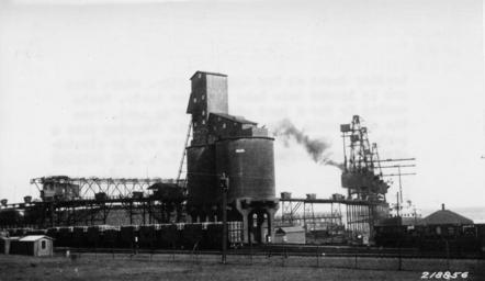 | Keywords: Photograph of Loading Docks at Two Harbors, Minnesota - NARA - 2127490.jpg Scope and content Original caption Loading docks at Two Harbors Minn where iron ore is loaded onto Lake Superior boats Boats coming in for a load of iron bring coal Note the clam-shell bucket in the air dropping into a boat The cars on the trestle are run by electricity without drivers General notes The original caption is incorrect This is the Duluth and Iron Range Railroad coal facility at Agate Bay in Two Harbors Minnesota The boat is having coal unloaded The tram cars are on a continuous cable drive system that loops them around to the bridge crane that covers the storage field The storage field could hold 150 000 tons of mine run coal The concrete towers are a crushing and holding facility The large locomotives had worm gear coal feeders and could not handle mine run coal Each tower could hold 10 000 tons of crushed coal I am sure the Forest Service has interest in this photograph because of the volume of pulpwood logs on flat cars next to the coal towers Mel Sando Lake County Historical Society 2127490 Local identifier 218856 Department of Agriculture Forest Service Region 9 Eastern Region 1965 - Most Recent <br /> Department of Agriculture Division of Forestry 1881 - 07/01/1901 Predecessor NARA-Place Superior National Forest Lake Minnesota forest 4075007 47 75 -91 5 <br /> NARA's Great Lakes Region Chicago NRDA 7358 South Pulaski Road Chicago IL 60629-5898 1927-07-25 Record group Record Group 95 Records of the Forest Service 1870 - 2008 Record group ARC 424 Historic Photographs compiled ca 1880 - ca 1970 Series ARC 1812856 File unit File unit ARC Variant control numbers Agency-Assigned Identifier 218856 Other versions <gallery> File Photograph_of_Loading_Docks_at_Two_Harbors _Minnesota_-_NARA_-_2127490 tif tif File Photograph_of_Loading_Docks_at_Two_Harbors _Minnesota_-_NARA_-_2127490 jpg jpg </gallery> NARA-cooperation PD-USGov Lake freighters Two Harbors Minnesota Steel industry Loading rail freight Ore docks 1927 in Minnesota Duluth and Iron Range Railroad |