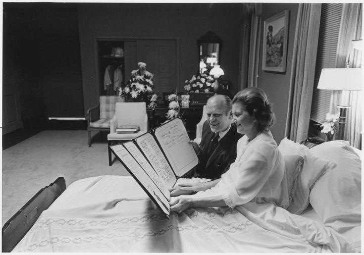 Keywords: Photograph of President Gerald Ford and First Lady Betty Ford Reading a Petition, Signed by All 100 Members of the... - NARA - 186773.tif This photograph depicts First Lady Betty Ford in bed with President Gerald Ford smiling beside her in the President's Suite at Bethesda Naval Hospital Bethesda Maryland Betty is holding a large quad-fold citation with multiple signatures General notes 186773 Local identifier GRF-WHPO-A1170 18A President 1974-1977 Ford White House Photographic Office 1974 - 1977 Kennerly David Hume 1947- Photographer 1312484 <br /> Institution Gerald R Ford Presidential Library Gerald R Ford Library NLGRF 1000 Beal Avenue Ann Arbor MI 48109-2114 1974-10-02 Record group Collection GRF-WHPO White House Photographic Office Collection Ford Administration 12/06/1973 - 01/20/1977 Record group ARC 1136 Gerald R Ford White House Photographs compiled 08/09/1974 - 01/20/1977 Series ARC 1756311 File unit File unit ARC Variant control numbers NAIL Control Number NLF-WHPO-A-A1170 18A yes Other versions Gerald R Ford Presidential Library and Museum-cooperation PD-USGov Betty and Gerald Ford Smiling Hospital rooms Breast cancer History of surgery Hospital beds Gerald R Ford Presidential Library and Museum series Gerald R Ford White House Photographs compiled 08/09/1974 - 01/20/1977 Reading in bed |