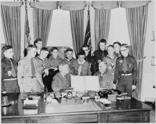 Keywords: Photograph of President Truman in the Oval Office, receiving a report on the accomplishments of the Boy Scouts from a... - NARA - 200268.tif Scope and content General notes 200268 Local identifier National Archives and Records Administration Office of Presidential Libraries Harry S Truman Library 04/01/1985 - Creator Abbie Rowe Harry S Truman Library NLHST 500 West U S Highway 24 Independence MO 64050-1798 1951-02-06 Record group Collection HST-AVC Audiovisual Collection 1957 - 2006 Record group ARC 1207 Photographs Relating to the Administration Family and Personal Life of Harry S Truman compiled 1957 - 2004 documenting the period 1849 - 2004 Series ARC 198606 File unit File unit ARC Variant control numbers NAIL Control Number NLT-AVC-PHT- 73 3501 yes Other versions <gallery> File Photograph_of_President_Truman_in_the_Oval_Office _receiving_a_report_on_the_accomplishments_of_the_Boy_Scouts_from_a _-_NARA_-_200268 tif tif File Photograph_of_President_Truman_in_the_Oval_Office _receiving_a_report_on_the_accomplishments_of_the_Boy_Scouts_from_a _-_NARA_-_200268 jpg jpg </gallery> NARA-cooperation PD-USGov NARA TIF images with categorized JPGs Black and white photographs February 1951 in the United States Harry S Truman in 1951 White House in 1951 Boy Scouts of America Children in the Oval Office People with Curtains Harry S Truman in the Oval Office Photographs by Abbie Rowe Scouting in Washington D C Black and white photographs of people Photographs taken on 1951-02-06 |