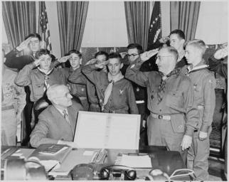 Keywords: Photograph of President Truman in the Oval Office receiving a report on the accomplishments of the Boy Scouts from a... - NARA - 200293.tif Scope and content General notes 200293 Local identifier National Archives and Records Administration Office of Presidential Libraries Harry S Truman Library 04/01/1985 - Creator Abbie Rowe Harry S Truman Library NLHST 500 West U S Highway 24 Independence MO 64050-1798 1951-02-06 Record group Collection HST-AVC Audiovisual Collection 1957 - 2006 Record group ARC 1207 Photographs Relating to the Administration Family and Personal Life of Harry S Truman compiled 1957 - 2004 documenting the period 1849 - 2004 Series ARC 198606 File unit File unit ARC Variant control numbers NAIL Control Number NLT-AVC-PHT- 73 3609 yes Other versions <gallery> File Photograph_of_President_Truman_in_the_Oval_Office_receiving_a_report_on_the_accomplishments_of_the_Boy_Scouts_from_a _-_NARA_-_200293 tif tif File Photograph_of_President_Truman_in_the_Oval_Office_receiving_a_report_on_the_accomplishments_of_the_Boy_Scouts_from_a _-_NARA_-_200293 jpg jpg </gallery> NARA-cooperation PD-USGov Photographs by Abbie Rowe Black and white photographs NARA TIF images with categorized JPGs February 1951 in the United States Harry S Truman in 1951 White House in 1951 Boy Scouts of America Children in the Oval Office 19510206 Harry S Truman in the Oval Office Scout salutes Scouting in Washington D C |