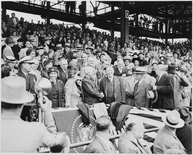 | Keywords: Photograph of President Truman shaking hands with Vice President Alben Barkley at Washington's Griffith Stadium, on... - NARA - 200201.tif Scope and content General notes 200201 Local identifier National Archives and Records Administration Office of Presidential Libraries Harry S Truman Library 04/01/1985 - NARA-Author Rowe Abbie 1905-1967 Photographer 8451352 <br /> Harry S Truman Library NLHST 500 West U S Highway 24 Independence MO 64050-1798 1950-04-18 Record group Collection HST-AVC Audiovisual Collection 1957 - 2006 Record group ARC 1207 Photographs Relating to the Administration Family and Personal Life of Harry S Truman compiled 1957 - 2004 documenting the period 1849 - 2004 Series ARC 198606 File unit File unit ARC Variant control numbers NAIL Control Number NLT-AVC-PHT- 73 3289 yes Other versions <gallery> File Photograph_of_President_Truman_shaking_hands_with_Vice_President_Alben_Barkley_at_Washington's_Griffith_Stadium _on _-_NARA_-_200201 tif tif File Photograph_of_President_Truman_shaking_hands_with_Vice_President_Alben_Barkley_at_Washington's_Griffith_Stadium _on _-_NARA_-_200201 jpg jpg </gallery> NARA-cooperation PD-USGov Harry S Truman in 1950 Photographs by Abbie Rowe Black and white photographs NARA TIF images with categorized JPGs |