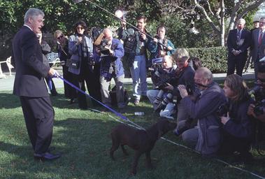 | Keywords: u.s. national archives usnationalarchives william j. clinton presidential library williamjclintonpresidentiallibrary nara:arcid=6036926 press buddy billy clinton billyclinton introductions 1997 outdoor Title: Photograph of President William Jefferson Clinton Introducing Buddy the Dog to the Press: 12/16/1997 Creator: President (1993-2001 : Clinton). White House Photograph Office. (01/20/1993 - 01/20/2001) Types of Archival Materials: Photographs and other Graphic Materials Contacts: William J. Clinton Library (NLWJC), 1200 President Clinton Avenue, Little Rock, AR 72201. Phone: 501-244-2877; Fax: 501-244-2881; Email: clinton.library@nara.gov Production Dates: 12/16/1997 From: Series: Photographs Relating to the Clinton Administration, compiled 01/20/1993 - 01/20/2001 Collection WJC-WHPO: Photographs of the White House Photograph Office (Clinton Administration), 01/20/1993 - 01/20/2001 Persistent URL: arcweb.archives.gov/arc/action/ExternalIdSearch?id=6036926 Access Restriction(s): Unrestricted Use Restriction(s): Unrestricted Title: Photograph of President William Jefferson Clinton Introducing Buddy the Dog to the Press: 12/16/1997 Creator: President (1993-2001 : Clinton). White House Photograph Office. (01/20/1993 - 01/20/2001) Types of Archival Materials: Photographs and other Graphic Materials Contacts: William J. Clinton Library (NLWJC), 1200 President Clinton Avenue, Little Rock, AR 72201. Phone: 501-244-2877; Fax: 501-244-2881; Email: clinton.library@nara.gov Production Dates: 12/16/1997 From: Series: Photographs Relating to the Clinton Administration, compiled 01/20/1993 - 01/20/2001 Collection WJC-WHPO: Photographs of the White House Photograph Office (Clinton Administration), 01/20/1993 - 01/20/2001 Persistent URL: arcweb.archives.gov/arc/action/ExternalIdSearch?id=6036926 Access Restriction(s): Unrestricted Use Restriction(s): Unrestricted |