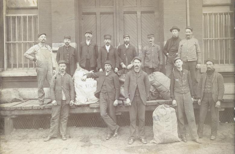 | Keywords: smithsonian institution smithsonianinstitution men moustache mustache hat standing outdoors working work workers mail postal thirteen kansas city kansascity sepia old west oldwest railroad conductors heritage national postal museum nationalpostalmuseum Date: c. 1910 Object number: A.2009-40 Medium: paper; photo-emulsion Description: A group of thirteen unidentified postal employees pose with mail sacks at a back entrance to the old Kansas City, Missouri, post office. Most of the clerks were part of the Post Office Department's Railway Mail Service (RMS). Unlike Railway Post Office (RPO) clerks who sorted mail on board moving trains, these RMS clerks worked to move and process mail going onto or coming off of RPO cars. National Postal Museum, Curatorial Photographic Collection Photographer: Unknown Place: United States of America      Missouri See more items in: National Postal Museum Collection Credit line: National Postal Museum, Curatorial Photographic Collection Photographer: Unknown Persistent URL:http://www.arago.si.edu/index.asp?con=2&cmd=1&id=207604 Repository:National Postal Museum View more collections from the Smithsonian Institution. Date: c. 1910 Object number: A.2009-40 Medium: paper; photo-emulsion Description: A group of thirteen unidentified postal employees pose with mail sacks at a back entrance to the old Kansas City, Missouri, post office. Most of the clerks were part of the Post Office Department's Railway Mail Service (RMS). Unlike Railway Post Office (RPO) clerks who sorted mail on board moving trains, these RMS clerks worked to move and process mail going onto or coming off of RPO cars. National Postal Museum, Curatorial Photographic Collection Photographer: Unknown Place: United States of America Missouri See more items in: National Postal Museum Collection Credit line: National Postal Museum, Curatorial Photographic Collection Photographer: Unknown Persistent URL:http://www.arago.si.edu/index.asp?con=2&cmd=1&id=207604 Repository:National Postal Museum View more collections from the Smithsonian Institution. |