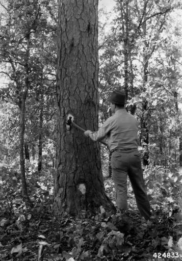 | Keywords: Photograph of a Ranger Marking a Tree for Cutting - NARA - 2129483.jpg Scope and content Original caption Ranger marks or otherwise designates trees for cutting General notes 2129483 Local identifier 424833 Department of Agriculture Forest Service Region 9 Eastern Region 1965 - Most Recent <br /> Department of Agriculture Division of Forestry 1881 - 07/01/1901 Predecessor NARA-Place Mark Twain National Forest Mo 3817536 37 -91 5 <br /> NARA's Great Lakes Region Chicago NRDA 7358 South Pulaski Road Chicago IL 60629-5898 10/1942 Record group Record Group 95 Records of the Forest Service 1870 - 2008 Record group ARC 424 Historic Photographs compiled ca 1880 - ca 1970 Series ARC 1812856 File unit File unit ARC Variant control numbers Agency-Assigned Identifier 424833 Other versions <gallery> File Photograph_of_a_Ranger_Marking_a_Tree_for_Cutting_-_NARA_-_2129483 tif tif File Photograph_of_a_Ranger_Marking_a_Tree_for_Cutting_-_NARA_-_2129483 jpg jpg </gallery> NARA-cooperation PD-USGov Mark Twain National Forest |