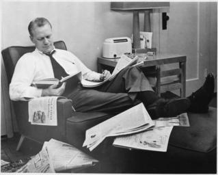 Keywords: Photograph of Representative Gerald R. Ford Reading at Home in his Alexandria, Virginia Apartment - NARA - 186880.tif Scope and content This photograph depicts Representative Gerald R Ford seated and reading with his feet on the hassock A white radio sits on the table to his left This photograph was taken in the Ford family apartment at 1521 Mount Eagle Place Alexandria Virginia General notes 186880 Local identifier GRF-WHPO-H0011 01 President 1974-1977 Ford White House Photographic Office 1974 - 1977 Gerald R Ford Presidential Library http //www fordlibrarymuseum gov/avproj/hseries/1950 asp H0011-1 Institution Gerald R Ford Presidential Library Gerald R Ford Library NLGRF 1000 Beal Avenue Ann Arbor MI 48109-2114 1953 Record group Collection GRF-WHPO White House Photographic Office Collection Ford Administration 12/06/1973 - 01/20/1977 Record group ARC 1136 Gerald and Betty Ford Historical Photographs compiled 08/09/1974 - 01/20/1977 documenting the period 1884 - 1974 Series ARC 186757 File unit File unit ARC Variant control numbers NAIL Control Number NLF-WHPO-A-H0011 01 yes Other versions Gerald R Ford Presidential Library and Museum-cooperation PD-USGov Gerald Ford before 1974 Newspaper readers Reading men Gerald R Ford Presidential Library and Museum series Gerald and Betty Ford Historical Photographs compiled 08/09/1974 - 01/20/1977 documenting the period 1884 - 1974 |