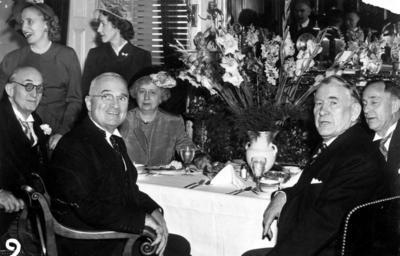 | Keywords: nara:arcid=6233764 u.s. national archives usnationalarchives harry s. truman library harrystrumanlibrary inaugural luncheon inauguralluncheon 1949 1940's 1940s harry s. truman harrystruman marian barkley truitt marianbarkleytruitt albein barkley albeinbarkley bess truman besstruman margaret truman margarettruman people groupshot blackandwhite monochrome black and white Original Caption: Photograph of the Trumans and Barkleys at an Inaugural Luncheon, ca. 01/20/1949 Created By: National Archives and Records Administration. Office of Presidential Libraries. Harry S. Truman Library. (04/01/1985 - ) From: Series: Photographs Relating to the Administration, Family, and Personal Life of Harry S. Truman, compiled 1957 - 2004, documenting the period 1849 - 2004 Contact: Harry S. Truman Library (NLHST), 500 West U.S. Highway 24, Independence, MO, 64050-1798. PHONE: 816-268-8272; FAX: 816-268-8295; EMAIL:truman.reference@nara.gov. Production Dates: ca. 01/20/1949 Scope and Content Note: President Harry S. Truman and Vice President Alben Barkley at lunch during inauguration festivities. Standing: Margaret Truman, Mrs. Marian Barkley Truitt. Seated, left to right: Unidentified man, President Truman, Mrs. Bess Wallace Truman, Vice President Barkley, and unidentified man. Persistent URL: arcweb.archives.gov/arc/action/ExternalIdSearch?id=6233764 Truman Library URL: www.trumanlibrary.org/photographs/view.php?id=2829&rr= Access Restrictions: Unrestricted Use Restrictions: Unrestricted Original Caption: Photograph of the Trumans and Barkleys at an Inaugural Luncheon, ca. 01/20/1949 Created By: National Archives and Records Administration. Office of Presidential Libraries. Harry S. Truman Library. (04/01/1985 - ) From: Series: Photographs Relating to the Administration, Family, and Personal Life of Harry S. Truman, compiled 1957 - 2004, documenting the period 1849 - 2004 Contact: Harry S. Truman Library (NLHST), 500 West U.S. Highway 24, Independence, MO, 64050-1798. PHONE: 816-268-8272; FAX: 816-268-8295; EMAIL:truman.reference@nara.gov. Production Dates: ca. 01/20/1949 Scope and Content Note: President Harry S. Truman and Vice President Alben Barkley at lunch during inauguration festivities. Standing: Margaret Truman, Mrs. Marian Barkley Truitt. Seated, left to right: Unidentified man, President Truman, Mrs. Bess Wallace Truman, Vice President Barkley, and unidentified man. Persistent URL: arcweb.archives.gov/arc/action/ExternalIdSearch?id=6233764 Truman Library URL: www.trumanlibrary.org/photographs/view.php?id=2829&rr= Access Restrictions: Unrestricted Use Restrictions: Unrestricted |