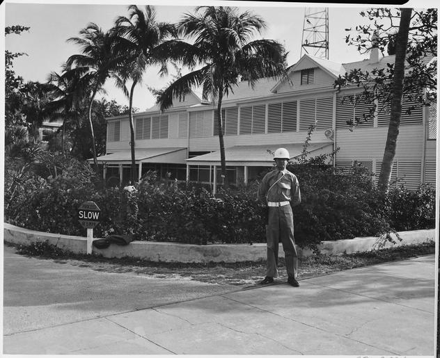| Keywords: Photograph of a U.S. Marine Corps guard standing outside the "Little White House," President Truman's vacation... - NARA - 200546.tif Scope and content General notes 200546 Local identifier National Archives and Records Administration Office of Presidential Libraries Harry S Truman Library 04/01/1985 - Harry S Truman Library NLHST 500 West U S Highway 24 Independence MO 64050-1798 1951-03-12 Record group Collection HST-AVC Audiovisual Collection 1957 - 2006 Record group ARC 1207 Photographs Relating to the Administration Family and Personal Life of Harry S Truman compiled 1957 - 2004 documenting the period 1849 - 2004 Series ARC 198606 File unit File unit ARC Variant control numbers NAIL Control Number NLT-AVC-PHT- 77 2026 yes Other versions <gallery> File Photograph_of_a_U S _Marine_Corps_guard_standing_outside_the_ Little_White_House _President_Truman's_vacation _-_NARA_-_200546 tif tif File Photograph_of_a_U S _Marine_Corps_guard_standing_outside_the_ Little_White_House _President_Truman's_vacation _-_NARA_-_200546 jpg jpg </gallery> NARA-cooperation PD-USGov People of the United States Marine Corps Harry S Truman Little White House NARA TIF images with categorized JPGs |