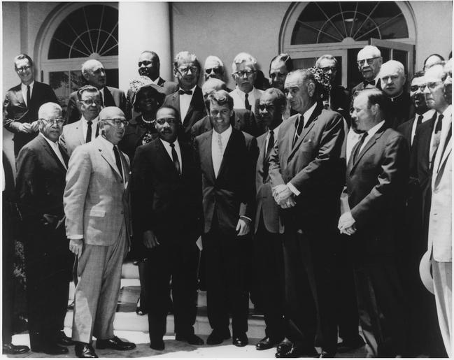 | Keywords: Photograph of White House Meeting with Civil Rights Leaders. June 22, 1963 - NARA - 194190.tif Civil Rights Leaders June 22 1963 Scope and content Photograph of meeting with Civil Rights leaders Front Row Martin Luther King Jr Robert F Kennedy Roy Wilkins Lyndon Baines Johnson Walter P Reuther Whitney M Young A Philip Randolph Second Row Second From Left Rosa Gragg Top Row Third From Left James Farmer General notes 194190 Local identifier Department of the Interior National Park Service II Region VI National Capital Region NARA-Author Department of the Interior National Park Service 1916 - 1933 Photographer 1185522 <br /> John F Kennedy Library NLJFK Columbia Point Boston MA 02125-3398 1963-06-22 Record group Collection JFK-WHP White House Photographs 12/19/1960 - 03/11/1964 Record group ARC 1177 Abbie Rowe White House Photographs compiled 12/06/1960 - 03/11/1964 Series ARC 194169 File unit White House Photograph Collection Abbie Rowe White House Photographs AR7993B 06/1960 - 03/31/1965 File unit ARC 194189 Variant control numbers NAIL Control Number NLK-WHP-AR-AR7993B-2TT yes Other versions thumb 100px left Image border removed NARA-cooperation PD-USGov White House in 1963 Robert F Kennedy Martin Luther King Jr in 1963 0622 Lyndon B Johnson in 1963 0622 Walter Reuther Roy Wilkins ~ Civil rights activists from the United States June 1963 in the United States Photographs by Abbie Rowe NARA images of Washington D C 1963 Black and white photographs of Washington D C 1963 Lyndon B Johnson and Martin Luther King Jr 19630622 |