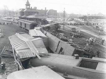 | Keywords: smithsonian institution smithsonianinstitution derailed train derailedtrain new hampshire newhampshire upside down mailcar upsidedownmailcar wreck train black white old station train wreck boston & maine 302 trainwreckbostonmaine302 national postal museum nationalpostalmuseum outdoor Date: November 13, 1954 Object number: A.2009-49 Medium: paper; photo-emulsion Description: Wreckage of Boston & Maine train #302, the Red Wing, just outside the Nashua, New Hampshire train station. The train had been traveling at a high rate of speed and derailed on a curve entering the station. The locomotives derailed, hitting freight cars on an adjacent siding as they moved. A female passenger was killed, and 53 others injured in the wreck. Among the injured was one of the Railway Post Office clerks, who was pinned under tables and furnishings in the mail car. That car, visible in the center of the photograph, landed on its roof. National Postal Museum, Curatorial Photographic Collection Photographer: Unknown Place: United States of America      New Hampshire See more items in: National Postal Museum Collection Credit line: National Postal Museum, Curatorial Photographic Collection Photographer: Unknown Persistent URL:http://www.arago.si.edu/index.asp?con=2&cmd=1&id=207613 Repository:National Postal Museum View more collections from the Smithsonian Institution. Date: November 13, 1954 Object number: A.2009-49 Medium: paper; photo-emulsion Description: Wreckage of Boston & Maine train #302, the Red Wing, just outside the Nashua, New Hampshire train station. The train had been traveling at a high rate of speed and derailed on a curve entering the station. The locomotives derailed, hitting freight cars on an adjacent siding as they moved. A female passenger was killed, and 53 others injured in the wreck. Among the injured was one of the Railway Post Office clerks, who was pinned under tables and furnishings in the mail car. That car, visible in the center of the photograph, landed on its roof. National Postal Museum, Curatorial Photographic Collection Photographer: Unknown Place: United States of America New Hampshire See more items in: National Postal Museum Collection Credit line: National Postal Museum, Curatorial Photographic Collection Photographer: Unknown Persistent URL:http://www.arago.si.edu/index.asp?con=2&cmd=1&id=207613 Repository:National Postal Museum View more collections from the Smithsonian Institution. |