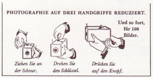 Keywords: Photographie auf drei Handgriffe reduziert (Kodak).jpg Artwork Creator Photographie auf drei Handgriffe reduziert Ziehen Sie an der Schnur Drehen Sie den Schlüssel Drücken Sie auf den Knopf Photography Reduced to three Motions 1 Pull the cord 2 Turn the Key 3 Press the button 1888/1892 Advertising Scan; Karl Steinorth Schnappschüsse »Runde Bilder« 100 Jahre Amteurfotografie form - Zeitschrift für Gestaltung Heft 123 III 1988 S 38; Artikel anlässlich der Ausstellung Schnappschüsse 1888 - 1892 zur photokina Kölnischer Kunstverein This image is in the public domain due to its age Other versions PD-old Kodak No 1 Camera advertising User guides |