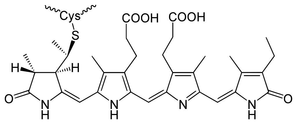 Keywords: Phycocyanobilin peptide linked.svg phycocyanobilin Phycocyanin de Die chromophore Gruppe Phycocyanobilin die an Phycocyanin verknüpft ist Own Yikrazuul 2009-02-27 Plant dyes Phycobilins