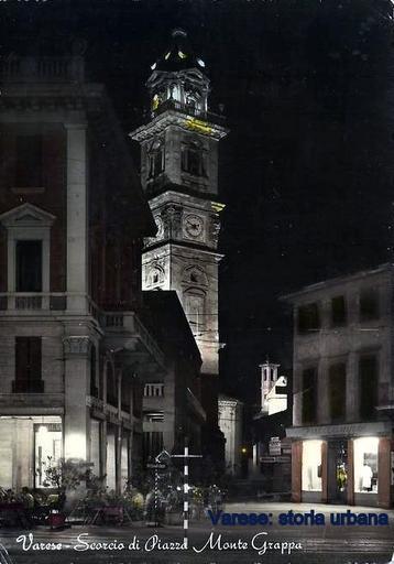 Keywords: Visione notturna di via Marconi. A sinistra palazzo Mascardi/Pini (ing. Camillo Lucchina, 1929), l'edificio a destra con le vetrine illuminate verrà abbattuto nel 1960. varese piazzamontegrappa