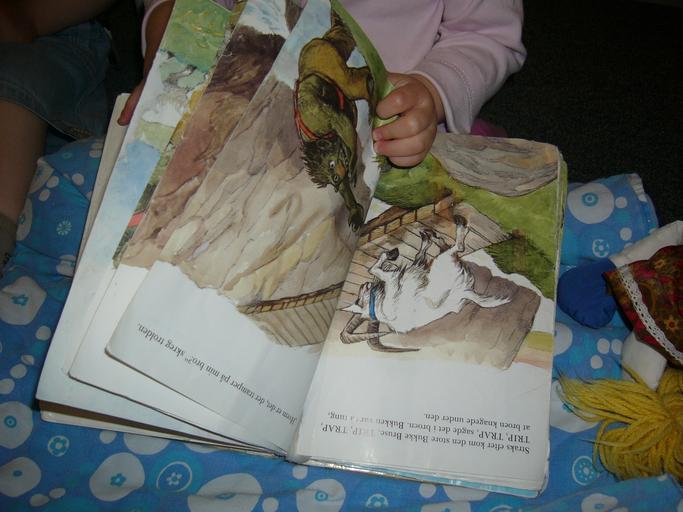 Keywords: Picturebook1.JPG Two-year old child reading a picture book Three Billy Goats Gruff Denmark Photographer Brams Norwegian fairy tales Reading children Picture books 2006-06-06 own assumed Brams The Three Billy Goats Gruff