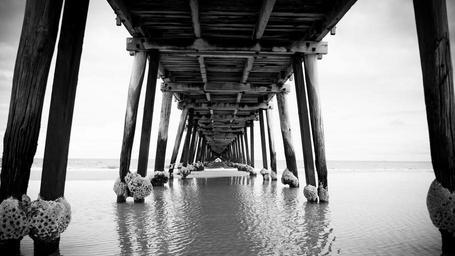 Keywords: pier dock bridge beach ocean sea water black and white wood nature