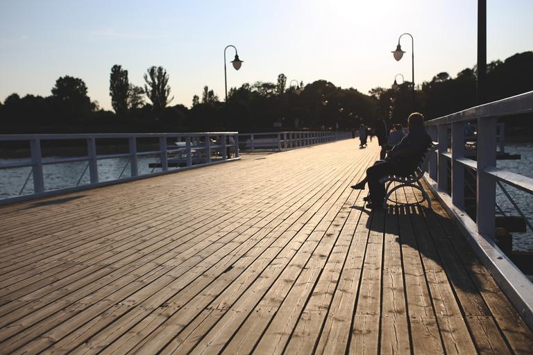 Keywords: pier sunset boards sea man sitting bench evening summer water trees