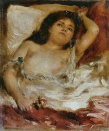 Keywords: Pierre-Auguste Renoir - Femme demi-nue couchée.jpg ca 1872 Oil on canvas cm 29 5 25 Institution Musée d'Orsay accession number RF 2443 object history credit line bottom right Renoir Renoir peintre du bonheur 1841-1919 de Gilles Néret Köln Taschen 2001 p 52 ISBN 9783822857410 000PE004083 PD-old-auto-1923 1919 Paintings by Pierre-Auguste Renoir in the Musée d'Orsay Paintings of women by Pierre-Auguste Renoir Women in bed in art Female toplessness in paintings Females with roses in art 1870 paintings Taken with Panasonic Lumix DMC-TZ2 Topless women in bed in art |
