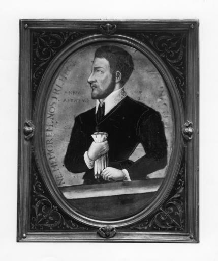 | Keywords: Pierre Courteys - Portrait of a Nobleman - Walters 44275.jpg This portrait shows a young man in half-length his face in profile to the left with blue eyes thick curly hair full beard and moustache his left hand on the hilt of his sword his right hand grasping white gloves He wears a black velvet doublet with an embroidered falling linen collar and a gold locket hanging from a gold chain Before him is a table covered with a green cloth inscribed in gilding in Italian NE MORTE NE FORTVNA CONTRA QVESTA POSSENZA After QVESTA is the monogram which stands for P Cor Pierre Courteys On the blue background runs an inscription in Latin ANNO AETATis SVE 27 and along the oval edge a second Latin inscription NE MEMOREM NOSTRI HEC REDAT IMAGO ca 1559 Renaissance technique painted enamel copper cm 16 5 12 2 accession number 44 275 36412 Andrew Fountaine of Narford Hall Norfolk England date and mode of acquisition unknown Sale Paris June 16 1884 lot 283 Frédéric Spitzer Paris by purchase Sale Paul Chevallier and Charles Mannheim Paris April 17 1893 lot 536 Charles Borradaile Brighton England before 1897 by purchase George Robinson Harding London date of acquisition unknown by purchase Henry Walters Baltimore date of acquisition unknown by purchase place of origin Limoges France Walters Art Museum license Renaissance portrait paintings in the Walters Art Museum Pierre Courteys Media contributed by the Walters Art Museum needs category review Portrait miniatures in the Walters Art Museum |