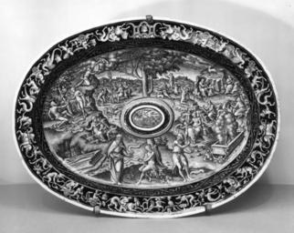 Keywords: Pierre Reymond - Oval Stand for Ewer - Allegory of the Redemption - Walters 44357.jpg In Northern Europe the cultural revolution of the Renaissance developed alongside the religious and political revolution embodied in the Reformation This ewer-stand is decorated with a Lutheran allegory in which Man is placed between Sin and Redemption Man is seated at the foot of a tree which is withered on the left side and in bloom on the right On the left of the composition are pictured the Original Sin of Adam and Eve and other scenes from the Old Testament Death is represented allegorically by the skeleton stretched on a tomb On the right is the Lamb of God symbolic of the Grace bestowed on Man in the New Testament The resurrecting figure of Christ rising from the tomb represents the victory over Sin and Death The enamel states in visual terms the teachings of St Paul that man's salvation depends solely on the Grace of God and not on the prescriptions of the Old Testament Law or of the Church of Rome Parading around the border are all manner of fantastic creatures- a windmill with a face trumpeting fauns snails riding elephants hares dragons and even irreverent caricatures of an emperor a pope a cardinal and two monks Such grotesques were the product of the lively imaginations of French and Flemish artists who were working at the French royal court at Fontainebleau 1566 technique painted enamel copper W 14 9/16 x L 19 3/4 in 37 x 50 2 cm accession number 44 357 18713 George Robinson Harding London by purchase Henry Walters city Baltimore Walters Art Museum Henry Walters Acquired by Henry Walters 1911 place of origin Limoges France Walters Art Museum license Limoges painted enamels in the Walters Art Museum Pierre Reymond Media contributed by the Walters Art Museum needs category review Painted enamel art in the Walters Art Museum Law and Grace 1566 in art |