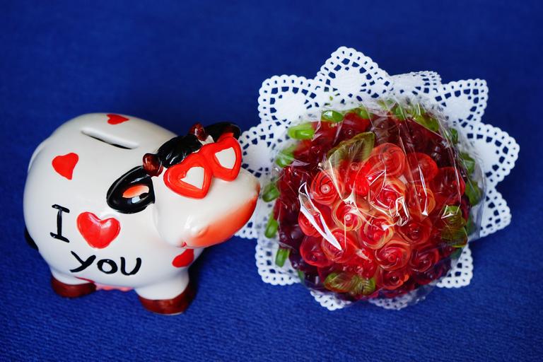 Keywords: pig lucky pig bouquet roses red roses valentine's day love luck romance romantic fruit jelly sweet delicious gummi bears strauß gummi bears piggy bank cool funny i love you heart friendship affection