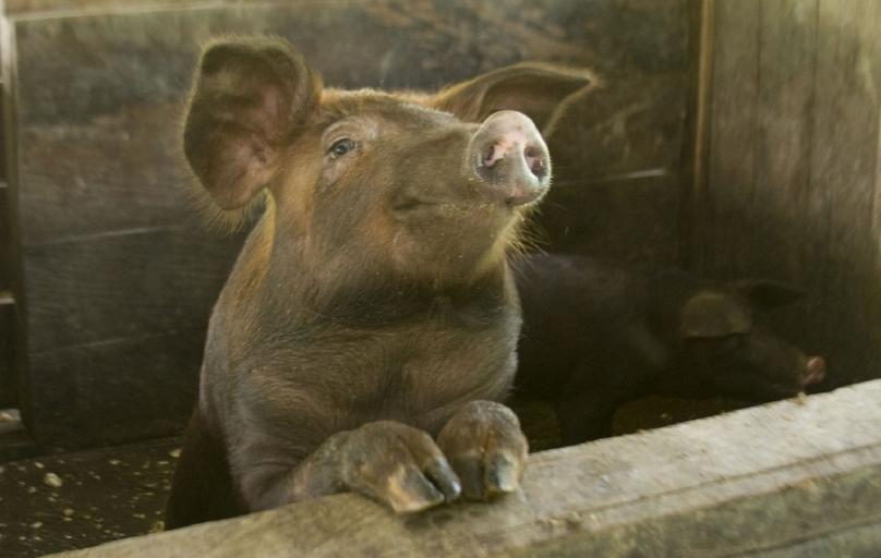 Keywords: pig swine pork agriculture portrait pen barn livestock animal head face nose snout feet ears rural domestic
