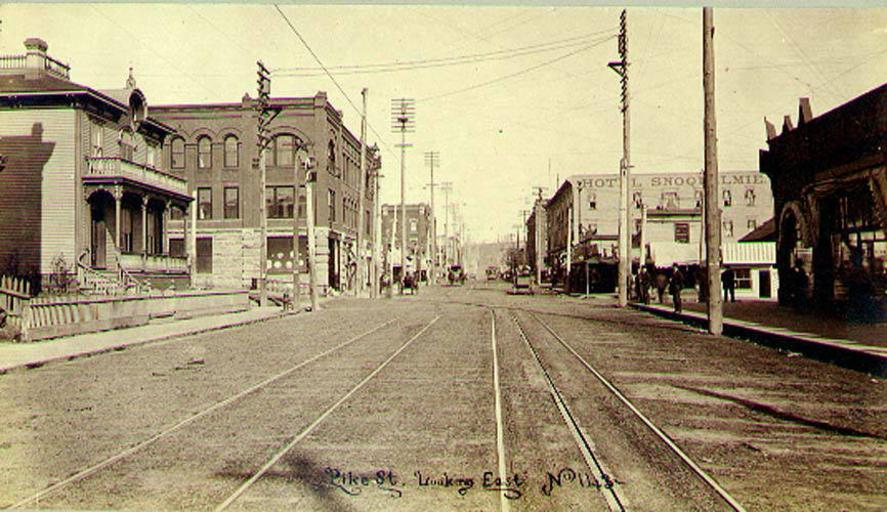 | Keywords: Pike St from near 1st Ave, Seattle, Washington, ca 1891 (LAROCHE 41).jpeg Photograph Creator Frank La Roche Caption on image Pike St looking east Subjects LCTGM Streets--Washington State --Seattle; Street railroads--Washington State --Seattle; Buildings--Washington State --Seattle; Hotels--Washington State --Seattle Subjects LCSH Pike Street Seattle Wash ; Hotel Snoqualmie Seattle Wash depicted place Seattle Washington ca 1891 Institution University of Washington UWASH-LAROCHE-source accession number laroche 41 PD-old-auto-1923 1936 Information field Order Number LAR011 Pike Street Seattle Tram tracks in Seattle historic Houses in Seattle Hotel Snoqualmie Downtown Seattle Washington Seattle Washington in the 1890s Black and white photographs |