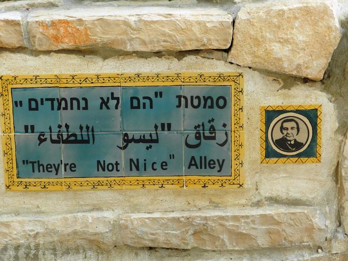 | Keywords: PikiWiki Israel 15327 Musrara neighborhood Jerusalem.jpg The Black Panthers social movement of Sephardi/Oriental Jews originated in the Musrara neighborhood in the early 70's Then Israeli Prime Minister Golda Meir said They are not nice people Hebrew hem lo nekhmadim This alley is named for her saying <br/> It's possible that the Arabic would be more correctly ليسوا لطفاء תנועת המחאה החברתית הפנתרי השחורי קמה בתחי ת שנות השבעי בשכונת העוני מוסררה בירוש י ראש הממש ה אז גו דה מאיר אמרה ע יה שה א נחמדי הסימטה הנחמדה הזאת מנציחה את האמירה Original Image Name סימטאת ה א נחמדי במוסררה Notes סיור במסגרת סוף שבוע הבתי הפתוחי בירוש י Location ירוש י שכונת מוסררה Hedva Sanderovitz via the http //www pikiwiki org il action gallery img_id 15327 PikiWiki - Israel free image collection project 2011-11-05 חדוה שנדרוביץ FoP-Israel Hedva Sanderovitz Trilingual signs in Jerusalem Street signs in Jerusalem Musrara Golda Meir Rectangular signs 2011 photographs pikiwiki |