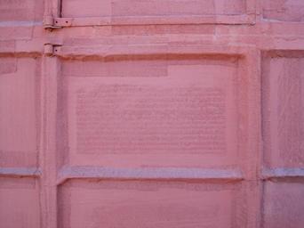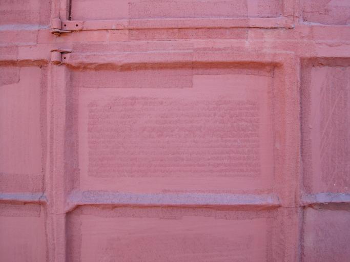Keywords: pink entirely covered painted over solidly window window panes window frames texture overlapping patches opaque panes hinges sealer