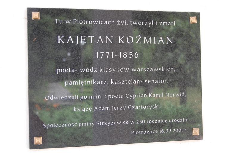 Keywords: Piotrowicekozmian.JPG pl Tablica upamiętniająca życie i twórczość Kajetana Koźmiana w Piotrowicach own Archeo16 2008 Kajetan Koźmian
